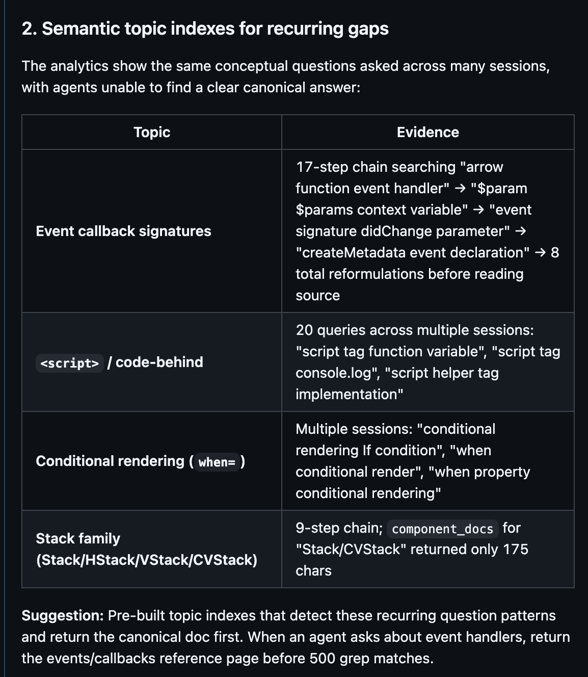 As a result we've dropped the intriguing idea of pattern search for now. Maybe we'll find a reason to bring it back. Or maybe you will! If you suspect the MCP server could be doing a better job with the questions your agents are asking it, try turning an agent loose on the MCP logs. If the analysis seems sound and the recommendations promising, raise an issue and share that info, we'll take a look.