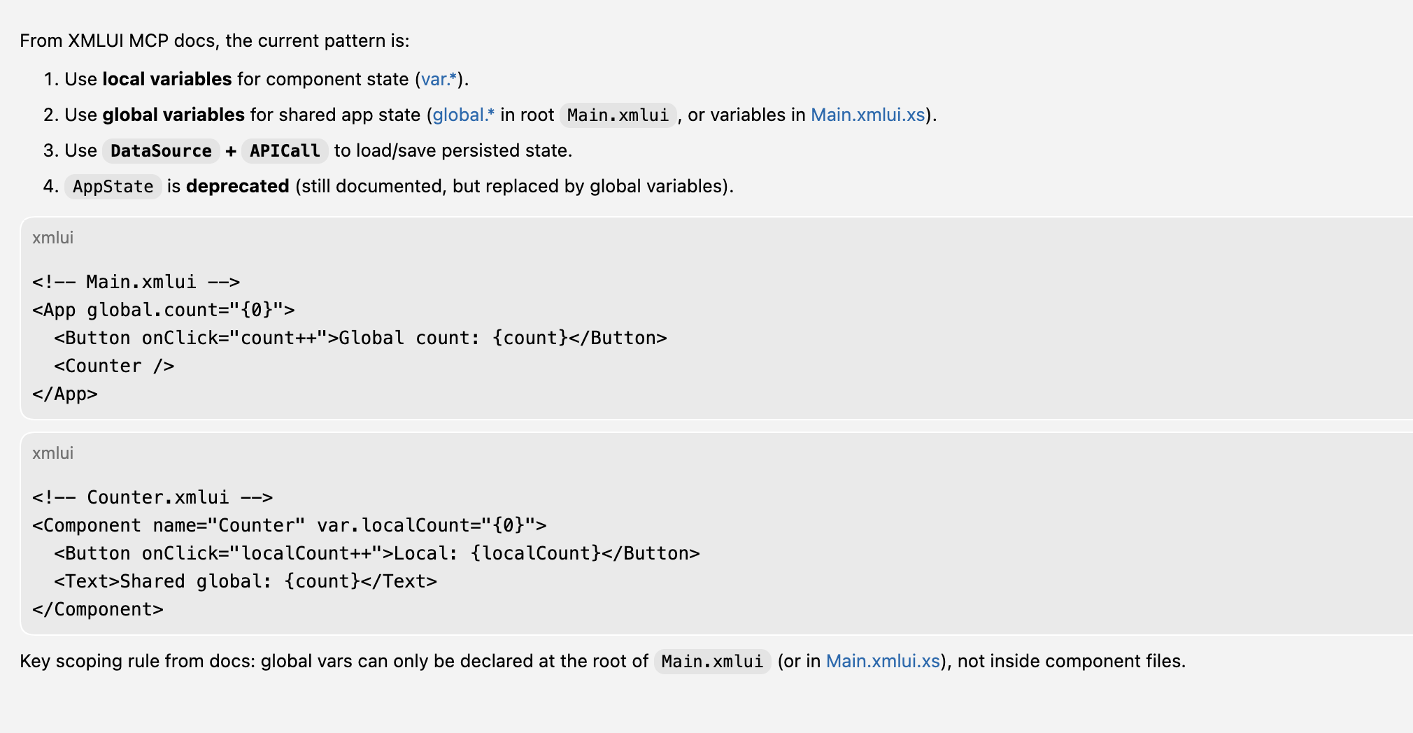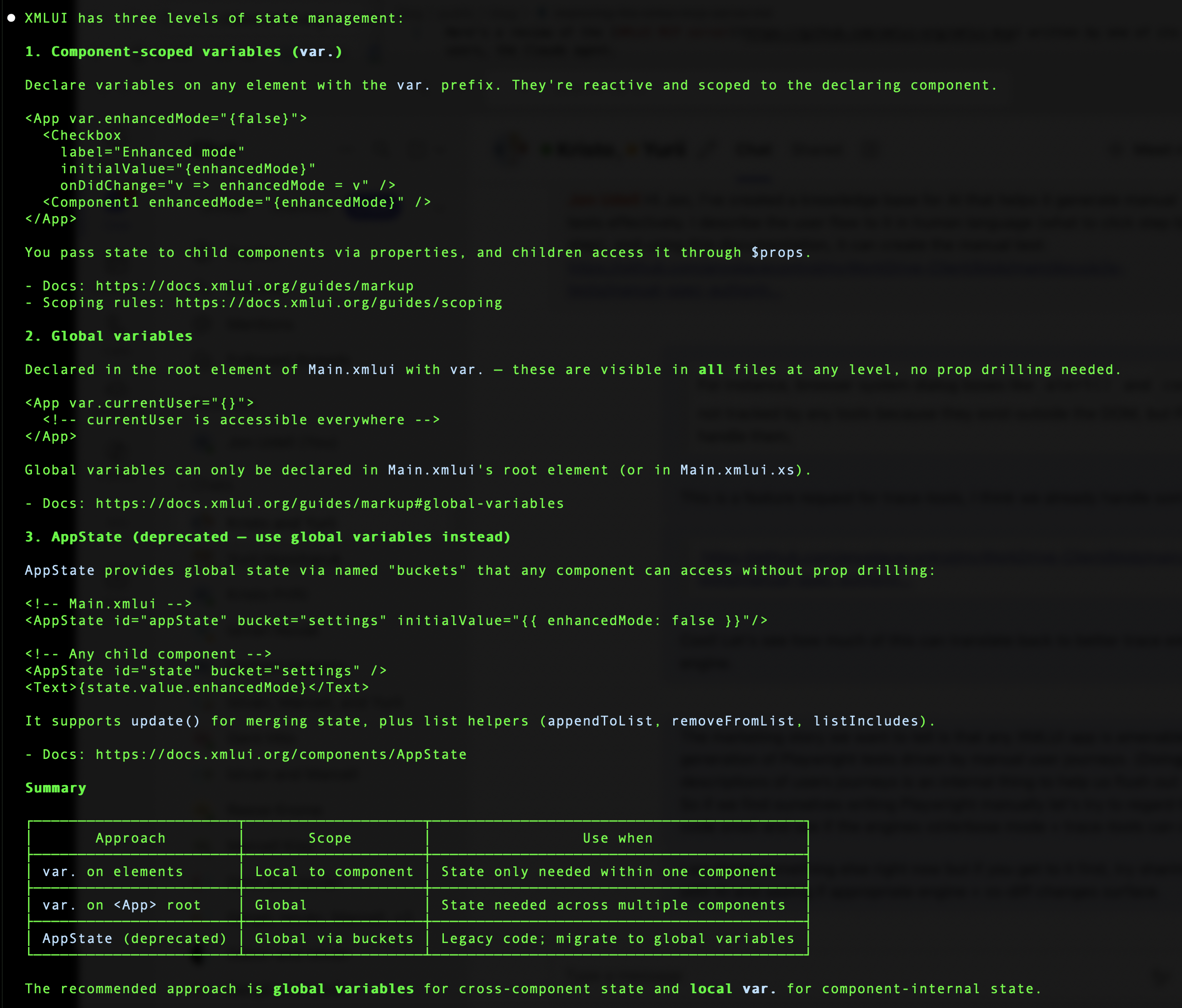 Suppose as an XMLUI developer you ask "What's the best way to manage state in XMLUI?" Here's how Claude uses various tools to answer the question.